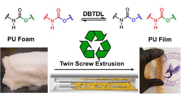 近期,西北大學(xué)的William R. Dichtel教授將二月桂酸二丁基錫(DBTDL)引入交聯(lián)的PU泡沫中,通過動態(tài)氨基甲酸酯交換反應(yīng)使泡沫具有可塑性,然后使用雙螺桿擠出機去除泡沫中的空氣,形成一種比原PU泡沫價值更高的材料,這種材料具有較強重塑性,可加工成堅硬耐用的塑料或柔軟彈性的薄膜,用于汽車保險杠、表帶、購物車或滑板輪等產(chǎn)品。這項技術(shù)將使商用PU廢料進一步回收利用,并推動其他熱固性材料再處理的進一步發(fā)展!