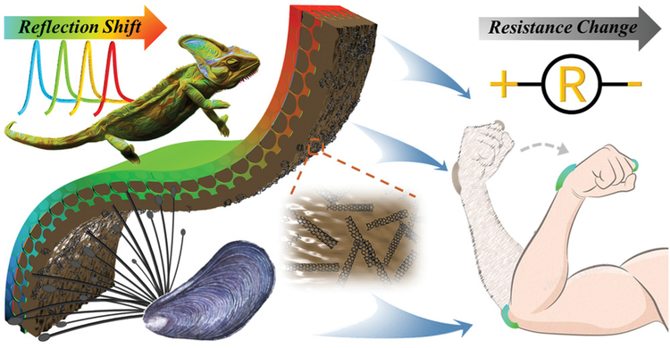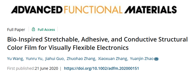 最近, 東南大學趙遠錦教授在《 Advanced Functional Materials》上發(fā)表了題為“ Bio‐Inspired Stretchable, Adhesive, and Conductive Structural Color Film for Visually Flexible Electronics”的文章,他們從 貽貝的粘附特性和 變色龍的變色機理出發(fā),提出了一種 新穎的碳納米管-聚多巴胺(PDA)和彈性聚氨酯(PU)聚合物雜化的結構色薄膜,用于可視化柔性電子。他們將導電CNTs-PDA填料引入彈性PU反蛋白石支架中,由于PU層具有良好的柔韌性和反蛋白石結構,使其具有穩(wěn)定的拉伸性能和明亮的結構色彩。此外,由于PDA上含有鄰苯二酚基團,使薄膜具有較高的組織粘附性和自愈能力,CNTs的引入使薄膜具有良好的導電性。該薄膜 在拉伸過程中具有變色和機電特性,可作為雙信號柔性人體運動傳感器,用于 實時彩色傳感和電信號監(jiān)測。這些特性表明,混合導電結構色薄膜可以提高柔性電子學的實用價值。