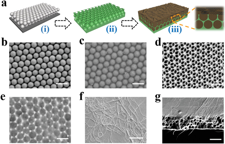圖1 雜化薄膜的結構與微結構。a) 聚合物導電水凝膠雜化結構色薄膜的形成過程和微觀結構示意圖。(b-g)掃描電子顯微鏡(SEM)圖像b)膠體晶體模板,c)聚氨酯滲透膠體晶體,d)聚氨酯(PU)反蛋白石支架,聚合物導電水凝膠雜化膜的內部(e)、表面(f)和橫截面(g)。(i) 指(b);(ii)指(d);(iii)指(e-g)。