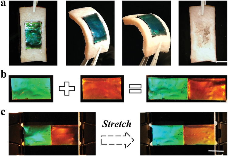 圖3 雜化薄膜的附著力和自愈性。a) 高分子導電水凝膠雜化結構色薄膜在豬皮膚上逐漸彎曲的照片。b) 兩段混合結構彩色膜的自愈合過程。c) 混合結構色膜的機械響應變色能力。