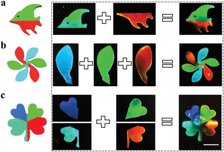 通過使用模板成型方法,可以容易地以不同的模式設計薄膜,例如 魚、六葉花和四瓣三葉草。在這一過程中,首先產(chǎn)生具有不同結構色的雜化膜?;谏鲜鲎杂匦?,這些片段可以粘合在一起,形成一個完整的物體。這些復雜的圖案薄膜使其成為 不同領域的功能材料。