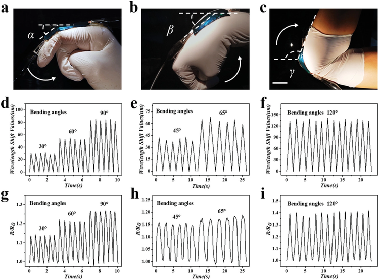 圖5 電導率對各種實時人體運動的響應。a-c)分別對a)手指、b)手腕和c)肘部的彎曲運動響應的聚合物導電水凝膠混合結構色膜的照片。α、 β和γ分別表示手指、手腕和肘部彎曲運動的彎曲角度。d-f)薄膜的波長偏移值,分別對應于d)手指、e)手腕和f)肘部的不同彎曲角度。g-i)混合結構色膜的相對電阻隨g)手指、h)手腕和i)肘部的不同角度而變化。
