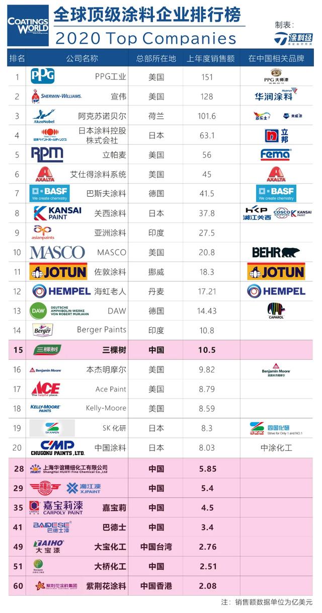 在中國涂料企業(yè)的表現(xiàn)方面,三棵樹憑借2019年度銷售業(yè)績的大幅增長,也使得排名得到大幅躍升,以10.5億美元的銷售額排名第15,成為首家躋身全球前20的中國涂料企業(yè);上海華誼精細(xì)化工有限公司(包含原上海涂料,簡稱華誼精化)以銷售額5.85億美元排名第28;湘江涂料以5.39億美元排第29名;嘉寶莉以4.50億美元位列第35;巴德士以3.4億美元列第41;大寶化工以2.76億美元列第49;大橋化工以2.51億美元列第51;紫荊花涂料集團(tuán)以2.08億美元列第60。