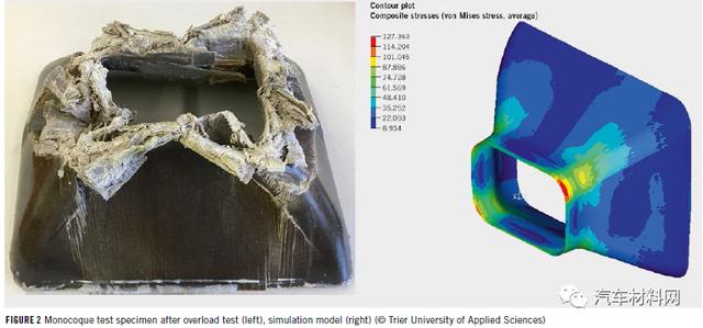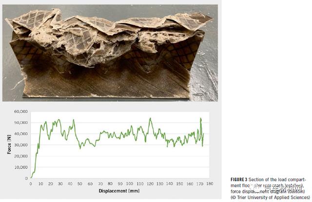 亞麻纖維的比重比碳纖維低,而強(qiáng)度和彈性模量值與玻璃纖維相似。由于它們僅需要大約1-5%的能量輸入,在生產(chǎn)過(guò)程中會(huì)顯著降低CO2排放,因此車輛的整體能量平衡性具有優(yōu)勢(shì)。亞麻纖維增強(qiáng)組件在減振、發(fā)生碰撞時(shí)的碎裂行為方面提供了顯著優(yōu)勢(shì),并且沒(méi)有有害的纖維粉塵,方便處置或回收利用。目前,NFRP材料用于高應(yīng)力部件的可靠材料數(shù)據(jù)和經(jīng)驗(yàn)相對(duì)較少。因此,該項(xiàng)目的主要致力于確定材料特性并進(jìn)一步開(kāi)發(fā)尺寸標(biāo)注方法。通過(guò)使用有限元方法(FEM)進(jìn)行計(jì)算,可以實(shí)現(xiàn)結(jié)構(gòu)優(yōu)化,對(duì)其中涉及到的纖維層數(shù)、鋪層方向和順序進(jìn)行模擬,通過(guò)靜態(tài)和動(dòng)態(tài)載荷測(cè)試進(jìn)行了驗(yàn)證(具體如圖2)。在考慮前、后和側(cè)面碰撞安全性時(shí),NFRP制成的部件可通過(guò)管狀或波浪形結(jié)構(gòu)的壓碎實(shí)現(xiàn)約30kJ/kg的比能量吸收,這是傳統(tǒng)鋼制碰撞盒比能量吸收的兩倍左右,具體測(cè)試結(jié)果如圖3所示。