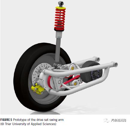 該車采用了后輪驅(qū)動(dòng),其優(yōu)點(diǎn)主要包括:可以在駕駛和車輛啟動(dòng)時(shí)進(jìn)行扭矩矢量控制,從而確保即使在后軸單獨(dú)電動(dòng)制動(dòng)時(shí),車輛也可以在中等橫向加速度下保持穩(wěn)定。這意味著可以完全省去后輪上的機(jī)械制動(dòng)器,進(jìn)一步減少了能源需求。該驅(qū)動(dòng)系統(tǒng)是通過(guò)驅(qū)動(dòng)裝置的擺臂實(shí)現(xiàn)的,擺臂作為帶有懸架支柱的拖臂同時(shí)接管車輪的導(dǎo)向裝置,在乘用車中是一種新穎設(shè)計(jì),具體如圖5。緊湊的水冷式發(fā)動(dòng)機(jī)位于由控制臂驅(qū)動(dòng)的旋轉(zhuǎn)軸附近,與輪轂電機(jī)相比,這大大減少了非懸掛的質(zhì)量,并且由于車輪的垂直加速度而導(dǎo)致的機(jī)械應(yīng)力更低。為了通過(guò)V形皮帶將扭矩和速度傳遞至驅(qū)動(dòng)輪,該車采用了合作伙伴Continental的P0混合動(dòng)力驅(qū)動(dòng)裝置進(jìn)行改裝。目前用于測(cè)試的驅(qū)動(dòng)裝置原型為開(kāi)放式管狀結(jié)構(gòu),項(xiàng)目組將更改為由鑄鋁制成的封閉式控制臂結(jié)構(gòu)。